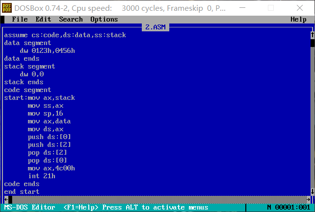 (1)对比程序执行后data段的数据和执行前的数据,发现数据不变。因为先执行出栈操作两次,再执行入栈操作两次,两次的顺序相反,正好将先出栈的数据后进栈,后出栈的数据先进栈。所以data中的数据没有发生变化。