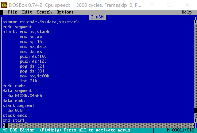 (3)该程序加载后,code段的段地址为X,则data段的段地址为X-2,stack段的段地址为X-1