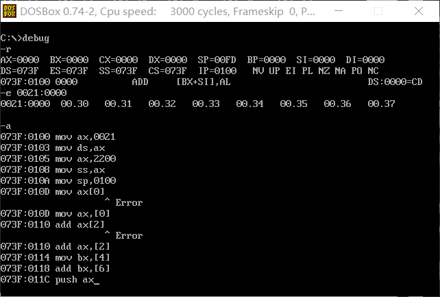 ① 在使用 a 命令输入指令调试前,使用 e 命令将内存单元 0021:0 ~0021:7 连续 8 个字节数据修改为 30H, 31H, 32H, 33H,34H,35H,36H,37H ② 将 P74 实验任务(1)中第 1行的 mov ax, ffff → 改为 mov ax, 0021 。