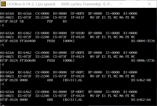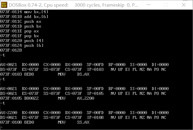 push bx ;sp= 00FCH ,修改的内存单元地址是 2200:00FC 内容为 6c6AH