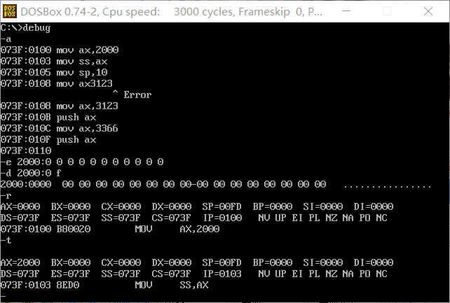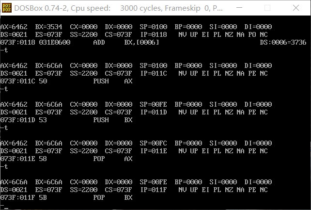 push ax ;sp= 00FEH ,修改的内存单元地址是 2200:00FE 内容为 6462H