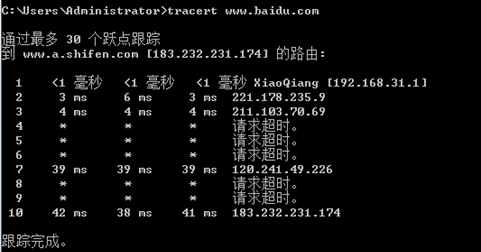 (1)先发送TTL为1的3个探测分组,检测到达第一个路由器的连通状态(路由器收到时将TTL减1,TTL变为0,路由器会将此数据包丢掉,并回送一个ICMP消息,tracert收到这个消息后,便知道这个路由器存在于这个路径上)。