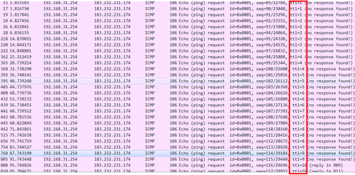 示例:tracert www.baidu.com,并抓取发送的数据包,显示TTL从1叠加至10.