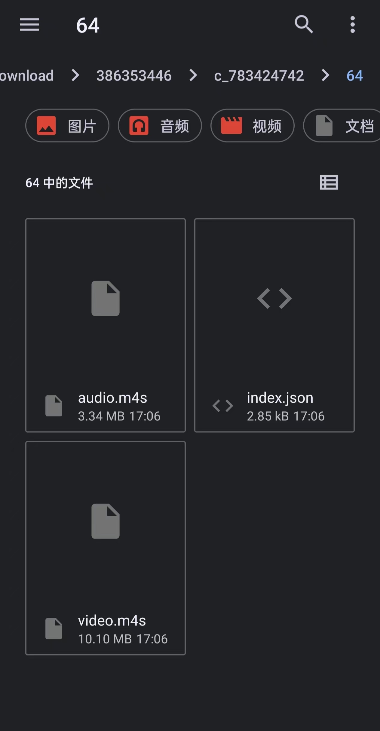 b站视频缓存文件夹命名方式为一串随机数字,进入后点击“64”文件夹,.m4s文件就是源视频的文件,其中audio.m4s为音频文件,video.m4s为视频文件。重命名音频文件后缀为.mp3/mp4。