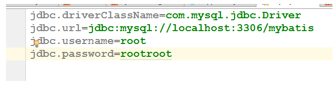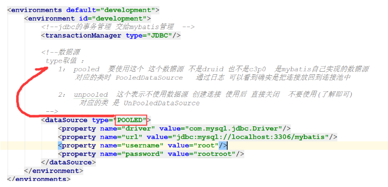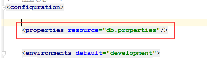 <?xml version="1.0" encoding="UTF-8"?> <!--mybaits全局配置文件的约束--> <!DOCTYPE configuration PUBLIC "-//mybatis.org//DTD Config 3.0//EN" "http://mybatis.org/dtd/mybatis-3-config.dtd"> <!--配置信息 --> <configuration> <environments default="development"> <environment id="development"> <!--jdbc的事务管理 交给mybatis管理 --> <transactionManager type="JDBC"/> <!--数据源 --> <dataSource type="POOLED"> <property name="driver" value="com.mysql.jdbc.Driver"/> <property name="url" value="jdbc:mysql://localhost:3306/mybatis"/> <property name="username" value="root"/> <property name="password" value="rootroot"/> </dataSource> </environment> </environments> <mappers> <!--<mapper resource="org/mybatis/example/BlogMapper.xml"/>--> </mappers> </configuration>