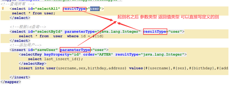 <!-- 如果是实体类 parameterType="com.shangma.cn.entity.User" 写类的完整路径 如果起了别名 例如 <typeAliases> <package name="com.shangma.cn.entity"/> </typeAliases> 则可以写别名 parameterType="user" 则使用时 #{}是这个实体类中的属性名 --> <insert id="saveUser" parameterType="user"> <selectKey keyProperty="id" order="AFTER" resultType="java.lang.Integer"> select last_insert_id(); </selectKey> insert into user(username,sex,birthday,address) values(#{username},#{sex},#{birthday},#{address}) </insert>