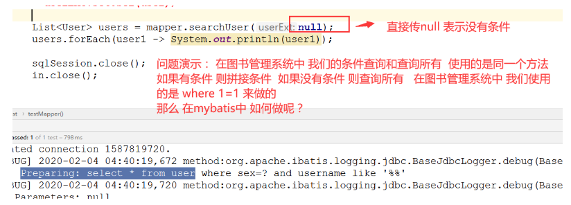 <select id="searchUser" parameterType="com.shangma.cn.entity.UserExt" resultMap="huige"> select * from user where 1=1 <if test="user!=null"> and sex=#{user.sex} </if> <if test="like!=null and like != '' "> and username like '%${lile}%' </if> </select>