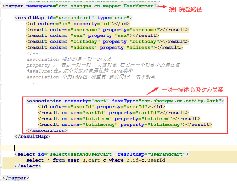 <?xml version="1.0" encoding="UTF-8"?> <!DOCTYPE mapper PUBLIC "-//mybatis.org//DTD Mapper 3.0//EN" "http://mybatis.org/dtd/mybatis-3-mapper.dtd"> <!-- 添加的内容如下 --> <!-- namespace 表示命名空间 对sql的操作进行分类化管理 有点类似包管理 --> <mapper namespace="huige"> <!--是根据id查询用户 select标签表示查询 id属性: 要求在一个namespace当中唯一 id随意写 但是要唯一 parameterType表示参数的java类型 resultType 表示查询后的返回值java类型 #{id} 表示占位符 传过来是什么 id就等于什么 如果是基本数据类型 这个id可以随意写 --> <select id="findUserById" parameterType="int" resultType="com.shangma.cn.entity.User"> select * from user where id=#{id} </select> </mapper>