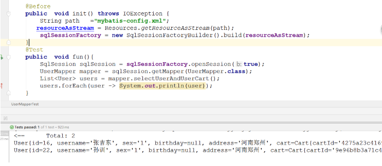 @Test public void searchUser() throws IOException { String path = "mybatis.xml"; InputStream resourceAsStream = Resources.getResourceAsStream(path); SqlSessionFactory sqlSessionFactory = new SqlSessionFactoryBuilder().build(resourceAsStream); SqlSession sqlSession = sqlSessionFactory.openSession(); List<User> users = sqlSession.selectList("huige.searchUser", "小"); users.forEach(user -> System.out.println(user)); sqlSession.close(); }