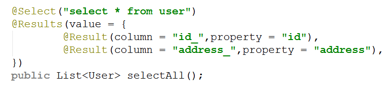 <!-- id属性 表示resultmap的唯一标识 不能重复 唯一的 随意写 type 表示返回值的类型 或者可以理解为 指定的是哪个类 result 表示 实体类属性和表的别名的对应关系 column:表示表的列明 property: 表示实体类属性名 如果列是id的话 可以使用id标签 --> <resultMap id="huige" type="user"> <id column="id_" property="id"/> <!--<result column="id_" property="id"/>--> <result column="address_" property="address"/> </resultMap>