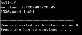 /* A simple C program */ #include <stdio.h> int main() { printf("hello,C\n"); printf("my stuno is:202083290305\n"); printf("2020,good luck!\n"); return 0; }