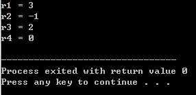 /* 用c语言实现的一个简单算术运算程序 */ #include <stdio.h> int main() { int x, y; // 定义两个整型变量,用来保存运算数据 int r1, r2, r3, r4; // 定义四个整型变量,用来保存加减乘除运算结果 x = 1; y = 2; r1 = x + y; r2 = x - y; r3 = x * y; r4 = x / y; printf("r1 = %d\n", r1); // 在屏幕上输出r1中存放的结果 printf("r2 = %d\n", r2); // 在屏幕上输出r2中存放的结果 printf("r3 = %d\n", r3); // 在屏幕上输出r3中存放的结果 printf("r4 = %d\n", r4); // 在屏幕上输出r4中存放的结果 return 0; }