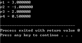 /* 用c语言实现的一个简单算术运算程序 */ #include <stdio.h> int main() { float x, y; // 定义两个float型变量,用来保存运算数据 float r1, r2, r3, r4; // 定义四个float型变量,用来保存加减乘除运算结果 x = 1; y = 2; r1 = x + y; r2 = x - y; r3 = x * y; r4 = x / y; printf("r1 = %f\n", r1); // 在屏幕上输出r1中存放的结果 printf("r2 = %f\n", r2); // 在屏幕上输出r2中存放的结果 printf("r3 = %f\n", r3); // 在屏幕上输出r3中存放的结果 printf("r4 = %f\n", r4); // 在屏幕上输出r4中存放的结果 return 0; }