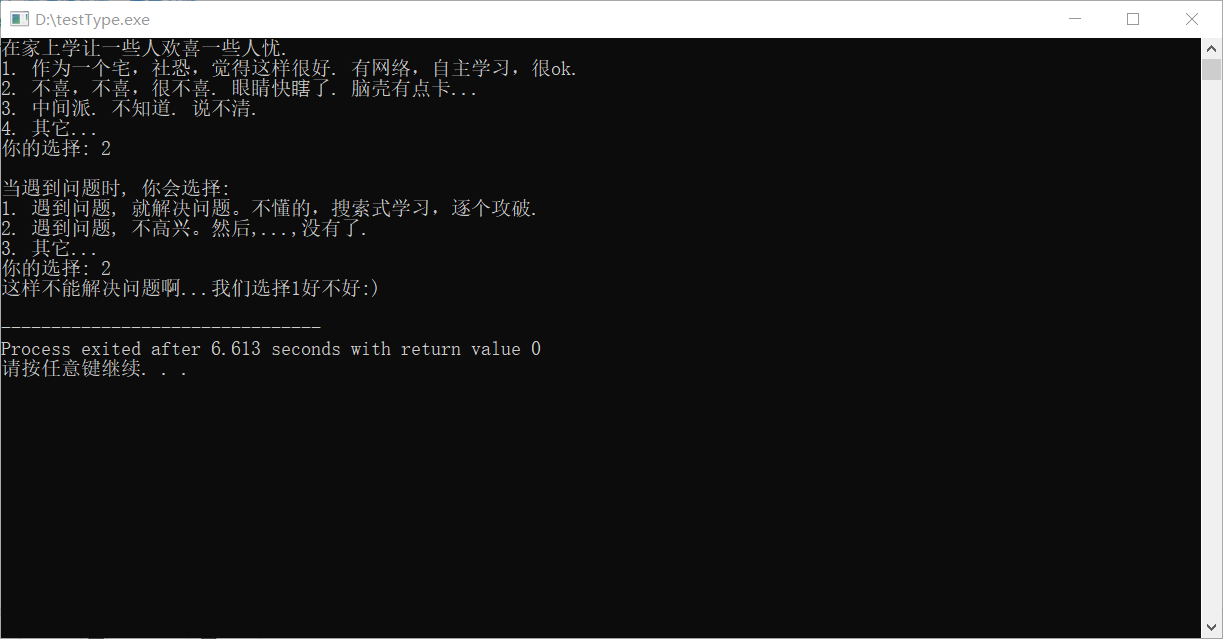 // 测试你是哪一类学习者 #include <stdio.h> int main() { int answer; char words[5000]; printf("在家上学让一些人欢喜一些人忧.\n"); printf("1. 作为一个宅,社恐,觉得这样很好. 有网络,自主学习,很ok.\n"); printf("2. 不喜,不喜,很不喜. 眼睛快瞎了. 脑壳有点卡...\n"); printf("3. 中间派. 不知道. 说不清.\n"); printf("4. 其它...\n"); printf("你的选择: "); scanf("%d", &answer); if(answer == 4) { printf("请补充说明你的想法: \n"); getchar(); // 这行代码为什么放在这里,大家暂时不用管 gets(words); // 从键盘输入你的想法,输完后,敲回车键 } printf("\n"); // 换行 printf("当遇到问题时, 你会选择:\n"); printf("1. 遇到问题, 就解决问题。不懂的,搜索式学习,逐个攻破.\n"); printf("2. 遇到问题, 不高兴。然后,...,没有了.\n"); printf("3. 其它...\n"); printf("你的选择: "); scanf("%d", &answer); if(answer == 1) printf(":)\n"); else if(answer == 2) printf("这样不能解决问题啊...我们选择1好不好:)\n"); else if(answer == 3) { printf("请补充说明你的想法: \n"); getchar(); // 这行代码为什么放在这里,大家暂时不用管 gets(words); // 从键盘输入你的想法,输完后,敲回车键 } return 0; }