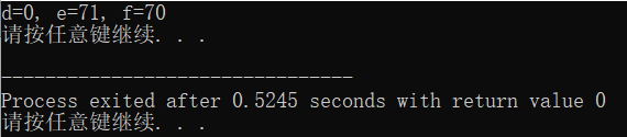 #include <stdio.h> #include <stdlib.h> int main() { int a=5, b=7, c=100, d, e, f; d = a/b*c; e = a*c/b; f = c/b*a; printf("d=%d, e=%d, f=%d\n",d,e,f); system("pause"); return 0; }