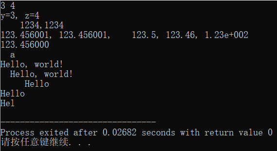 // ex2.cpp #include <stdio.h> int main() { int x=1234; float f=123.456; double m=123.456; char ch='a'; char a[]="Hello, world!"; // 定义一个数组a,数组中存放字符串常量hello,world! int y=3, z=4; printf("%d %d\n", y, z); printf("y=%d, z=%d\n", y,z); printf("%8d,%2d\n", x,x); printf("%f, %8f, %8.1f, %0.2f, %.2e\n",f,f,f,f,f); printf("%lf\n",m); printf("%3c\n", ch); printf("%s\n%15s\n%10.5s\n%2.5s\n%.3s\n",a,a,a,a,a); return 0; }