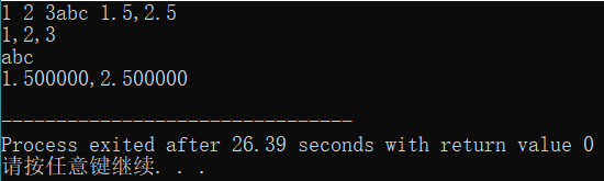 // ex3.cpp #include <stdio.h> int main() { double x,y; char c1,c2,c3; int a1,a2,a3; scanf("%d %d %d",&a1,&a2,&a3); printf("%d,%d,%d\n",a1,a2,a3); scanf("%c%c%c",&c1,&c2,&c3); printf("%c%c%c\n",c1,c2,c3); scanf("%lf,%lf",&x,&y); printf("%lf,%lf\n",x,y); return 0; }