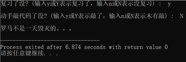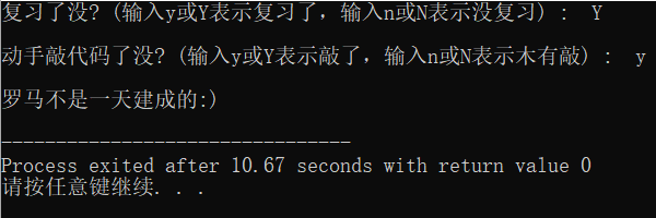 // ex5.cpp #include <stdio.h> int main() { char ans1, ans2; printf("复习了没? (输入y或Y表示复习了,输入n或N表示没复习) : "); ans1 = getchar(); // 从键盘输入一个字符,赋值给ans1 getchar(); // 思考这里为什么要加这一行 printf("\n动手敲代码了没? (输入y或Y表示敲了,输入n或N表示木有敲) : "); ans2 = getchar(); if((ans1==89||ans1==121)&&(ans2==89||ans2==121)) printf("\n罗马不是一天建成的:)\n"); else printf("\n罗马不是一天毁灭的。。。\n"); return 0; }