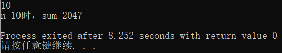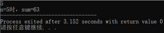 #include <stdio.h> #include <math.h> int main() { int n,sum; scanf("%d",&n); if(n<1||n>10) printf("invalid input"); else { sum=pow(2,n+1)-1; printf("n=%d时,sum=%d",n,sum); } return 0; }