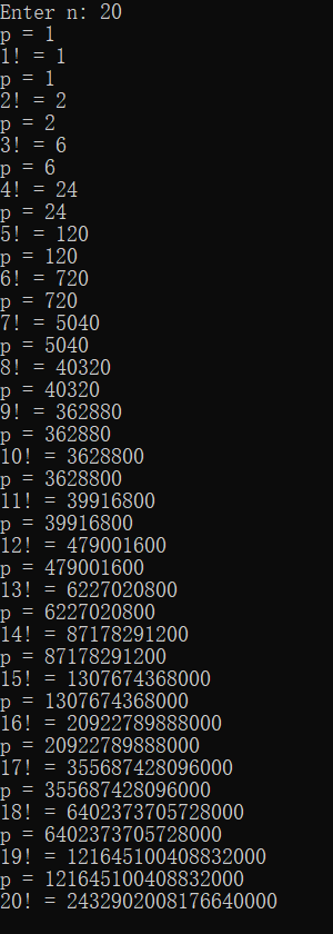 // 利用局部static变量计算阶乘 #include <stdio.h> long long fac(int n); // 函数声明 int main() { int i,n; printf("Enter n: "); scanf("%d", &n); for(i=1; i<=n; ++i) printf("%d! = %lld\n", i, fac(i)); return 0; } // 函数定义 long long fac(int n) { static long long p = 1; printf("p = %lld\n", p); p = p*n; return p; }
