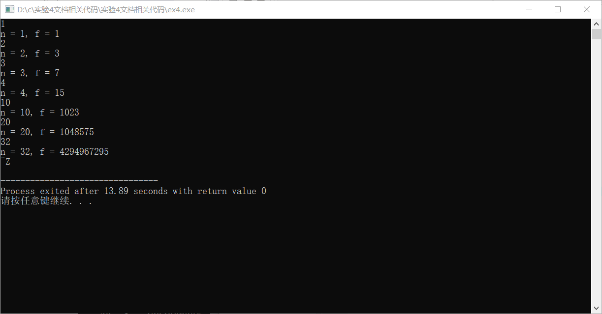 #include <stdio.h> long long fun(int n); // 函数声明 int main() { int n; long long f; while(scanf("%d", &n) != EOF) { f = fun(n); // 函数调用 printf("n = %d, f = %lld\n", n, f); } return 0; } // 函数定义 // 补足。。。 long long fun(int n){ long long f,i; if(n==0){ f=1; } else{ f=2*(fun(n-1)+1); } i=f; i-=1; return i; }