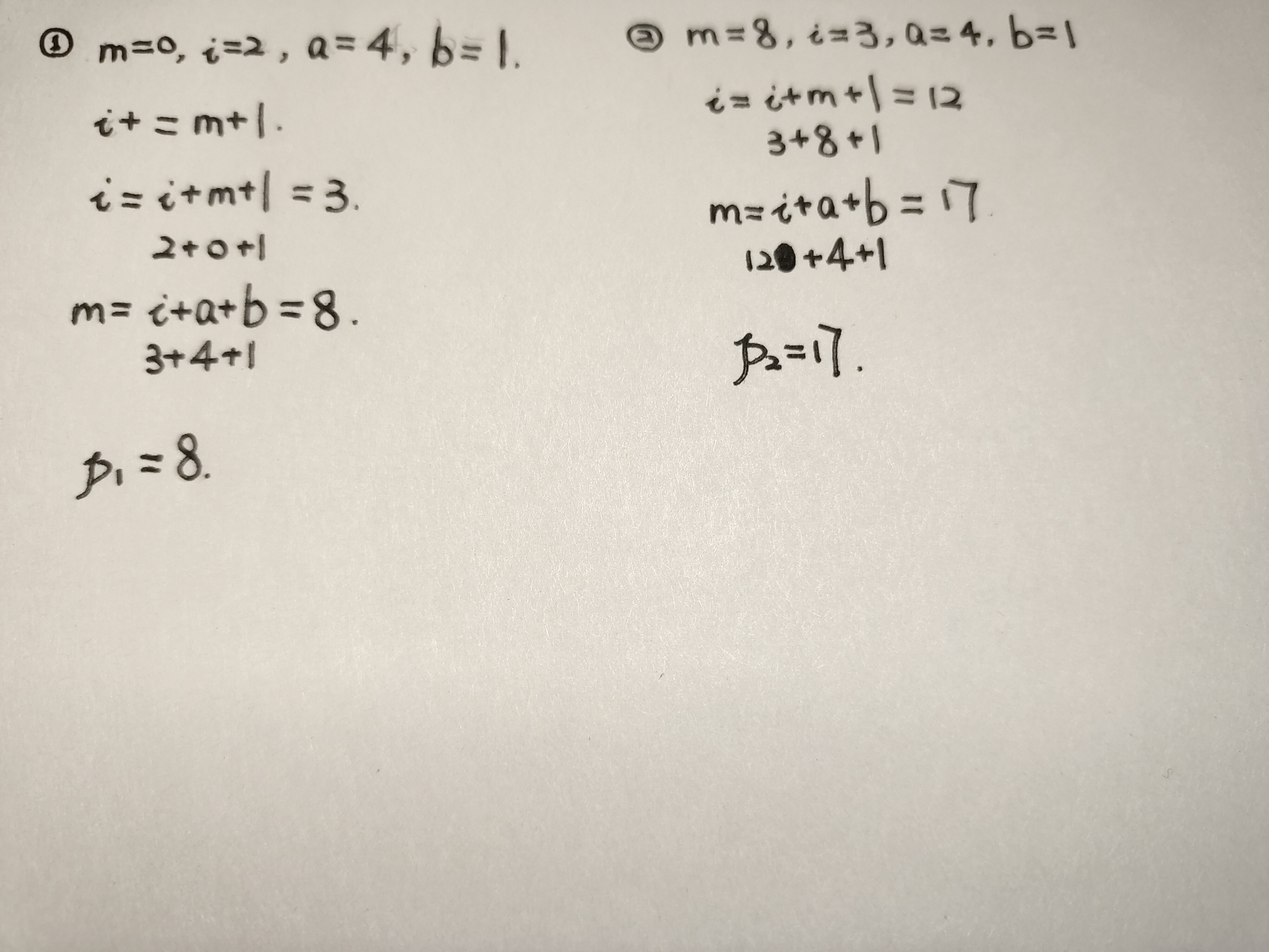 // 练习:局部static变量特性 #include<stdio.h> int func(int, int); int main() { int k=4,m=1,p1,p2; p1 = func(k,m) ; p2 = func(k,m) ; printf("%d,%d\n",p1,p2) ; return 0; } int func(int a,int b) { static int m=0,i=2; i += m+1; m = i+a+b; return (m); }