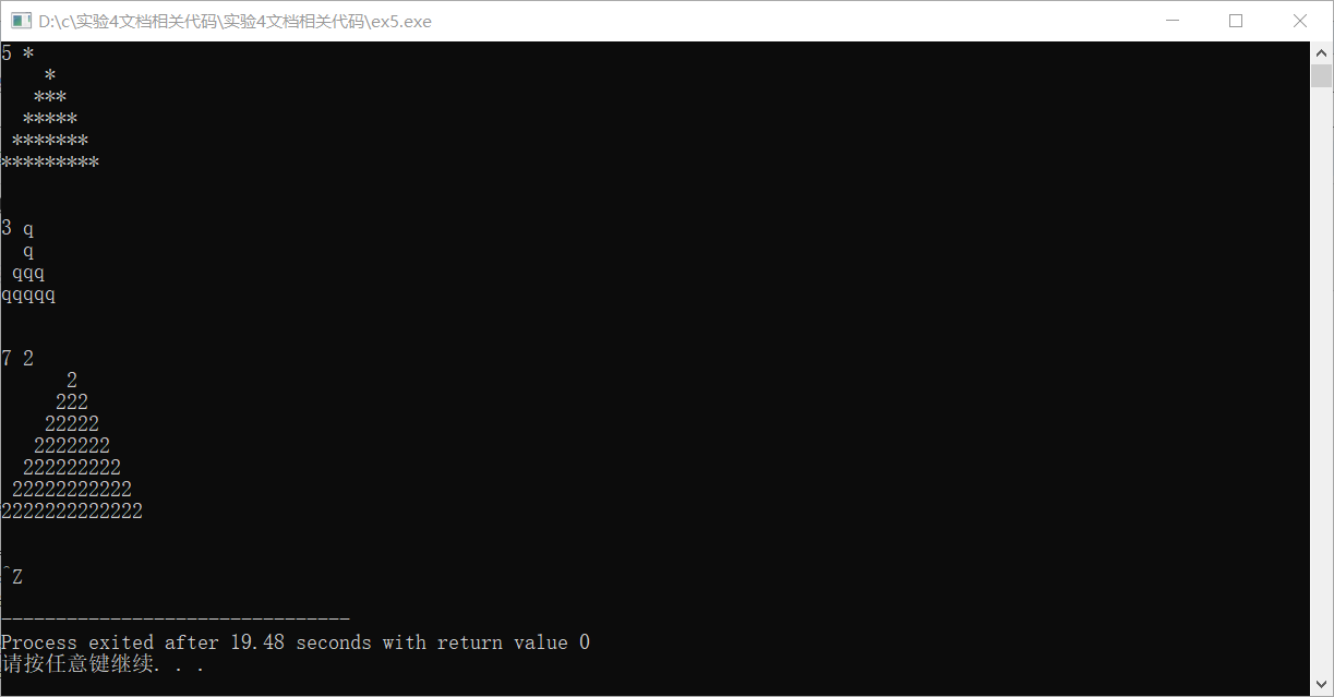 #include <stdio.h> void draw(int n, char symbol); // 函数声明 #include <stdio.h> int main() { int n, symbol; while(scanf("%d %c", &n, &symbol) != EOF) { draw(n, symbol); // 函数调用 printf("\n"); } return 0; } // 函数定义 // 补足代码。。。 void draw(int n, char symbol) { int i,j,k; for(i=1;i<=n;i++){ for(k=n;k>i;k--){ printf(" "); } for(j=1;j<=(2*i-1);j++){ printf("%c",symbol); } printf("\n"); } printf("\n"); }