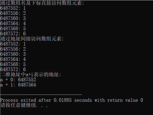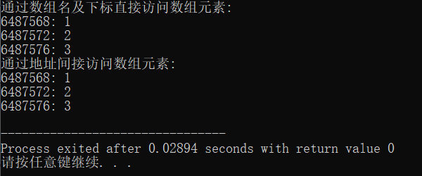#include <stdio.h> const int N=3; int main() { int a[N] = {1, 2, 3}; int i; printf("通过数组名及下标直接访问数组元素:\n"); for(i=0; i<N; i++) printf("%d: %d\n", &a[i], a[i]); printf("通过地址间接访问数组元素:\n"); for(i=0; i<N; i++) printf("%d: %d\n", a+i, *(a+i)); return 0; }
