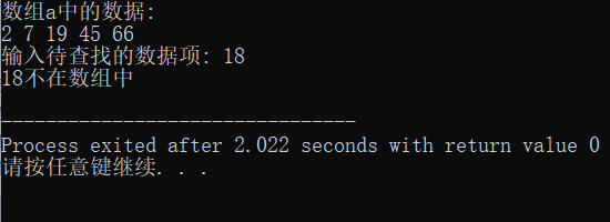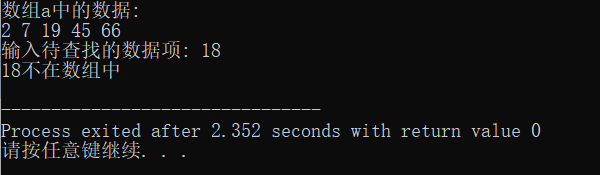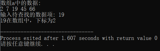 // 练习:使用二分查找,在一组有序元素中查找数据项 // 形参是数组,实参是数组名 #include <stdio.h> const int N=5; int binarySearch(int x[], int n, int item); // 函数声明 int main() { int a[N]={2,7,19,45,66}; int i,index, key; printf("数组a中的数据:\n"); for(i=0;i<N;i++) printf("%d ",a[i]); printf("\n"); printf("输入待查找的数据项: "); scanf("%d", &key); // 调用函数binarySearch()在数组a中查找指定数据项key,并返回查找结果给index // 补足代码① index=binarySearch(a,N,key); if(index>=0) printf("%d在数组中,下标为%d\n", key, index); else printf("%d不在数组中\n", key); return 0; } //函数功能描述: //使用二分查找算法在数组x中查找特定值item,数组x大小为n // 如果找到,返回其下标 // 如果没找到,返回-1 int binarySearch(int x[], int n, int item) { int low, high, mid; low = 0; high = n-1; while(low <= high) { mid = (low+high)/2; if (x[mid]==item) return mid; else if(x[mid]>item) high = mid - 1; else low = mid + 1; } return -1; }