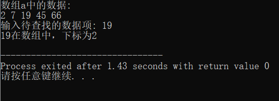 // 练习:使用二分查找,在一组有序元素中查找数据项 // 形参是指针变量,实参是数组名 #include <stdio.h> const int N=5; int binarySearch(int *x, int n, int item); // 函数声明 int main() { int a[N]={2,7,19,45,66}; int i,index, key; printf("数组a中的数据:\n"); for(i=0;i<N;i++) printf("%d ",a[i]); printf("\n"); printf("输入待查找的数据项: "); scanf("%d", &key); // 调用函数binarySearch()在数组a中查找指定数据项key,并返回查找结果给index // 补足代码① index=binarySearch(a,N,key); if(index>=0) printf("%d在数组中,下标为%d\n", key, index); else printf("%d不在数组中\n", key); return 0; } //函数功能描述: //使用二分查找算法在从x中查找特定值item,数组x大小为n // 如果找到,返回其下标 // 如果没找到,返回-1 int binarySearch(int *x, int n, int item) { int low, high, mid; low = 0; high = n-1; while(low <= high) { mid = (low+high)/2; if ( item == *(x+mid) ) return mid; else if(item < *(x+mid)) high=mid-1; else low=mid+1; } return -1; }