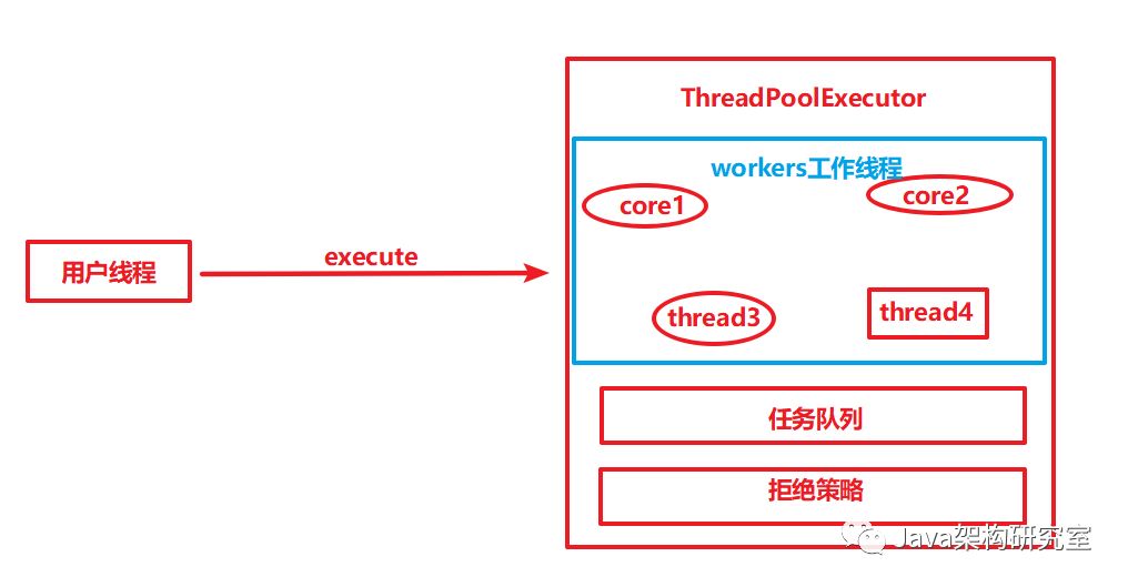 ⑤RejectedExecutionHandler:拒绝策略,表示当队列已满并且线程数量达到线程池最大线程数量的时候对新提交的任务所采取的策略,主要有四种策略:AbortPolicy(抛出异常)、CallerRunsPolicy(只用调用者所在线程来运行该任务)、DiscardOldestPolicy(丢掉阻塞队列中最近的一个任务来处理当前提交的任务)、DiscardPolicy(不做处理,直接丢弃掉)