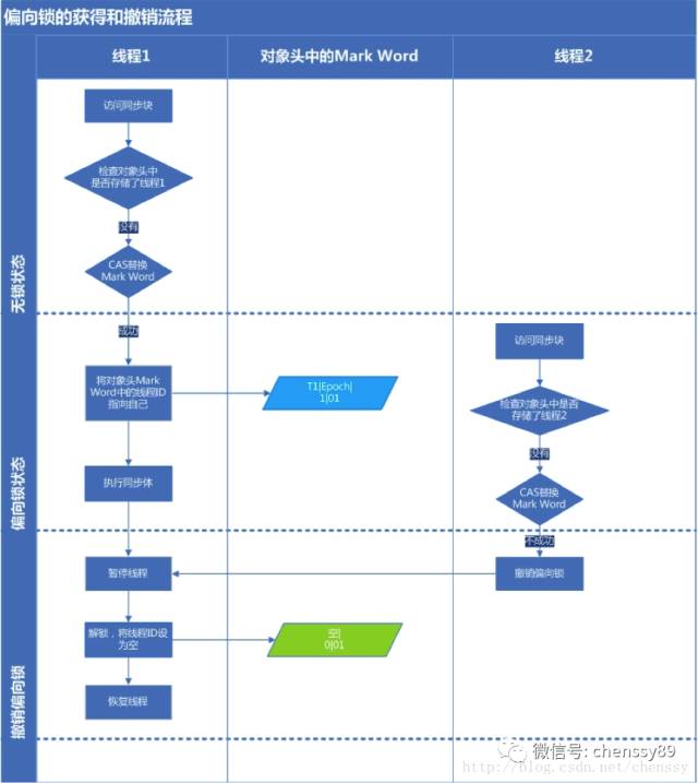 引入偏向锁主要目的是:为了在无多线程竞争的情况下尽量减少不必要的轻量级锁执行路径。上面提到了轻量级锁的加锁解锁操作是需要依赖多次CAS原子指令的。那么偏向锁是如何来减少不必要的CAS操作呢?我们可以查看Mark work的结构就明白了。只需要检查是否为偏向锁、锁标识为以及ThreadID即可,处理流程如下:获取锁