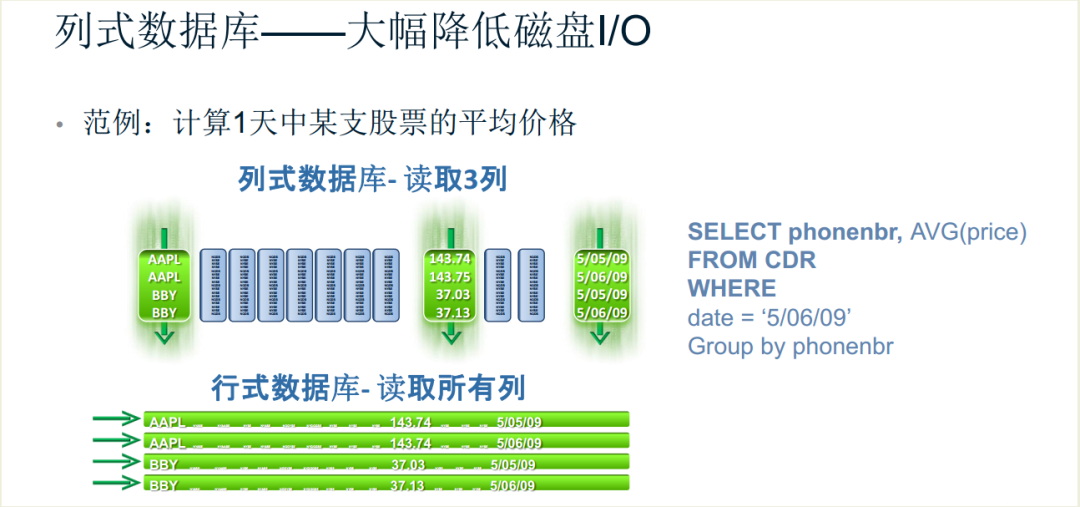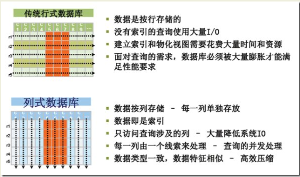相对行式数据库,像Mysql、Oracle、SqlServer等都是行式存储,是把同一行的数据放到相邻同一数据块种,而列式存储是把同一列的数据放到相邻同一数据块种,这样在进行计算类查询时,可以大大减少IO消耗,返回结果更快,采用列式存储后在进行数据记录写入的时候会麻烦一些。