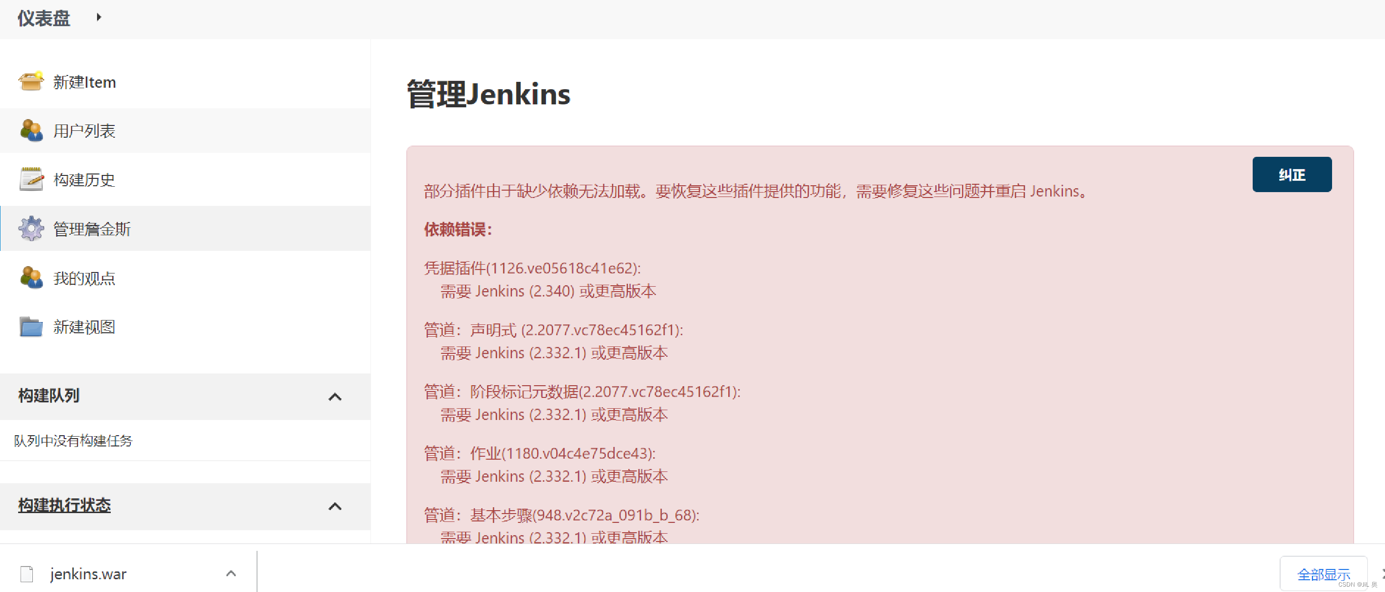 二、docker pull jenkins/jenkins拉取的版本是2.238的版本,这个版本的jenkins虽然下载插件不会报错,但是还有很多插件的下载需要更高的jenkins版本;见下图!不然就下载不下来(也可以通过docker升级jenkins版本来接,操作还是比较复杂,我也试了一下,没成功!)