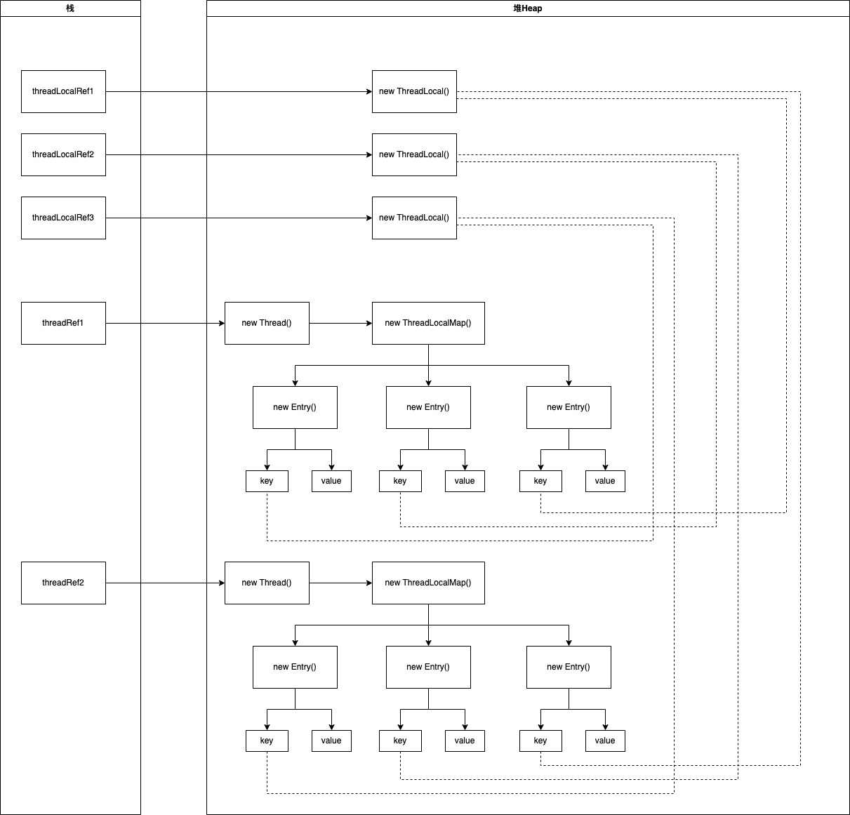上图中的虚线代表的是弱引用WeakReference。由图看出,在某一个Thread实例被销毁时,对应的ThreadLocalMap实例的key还在被ThreadLocal实例引用,是GCRoot可达的,如果此处是强引用,那就不会被GC回收,线程被多次创建销毁后,会出现OOM问题。