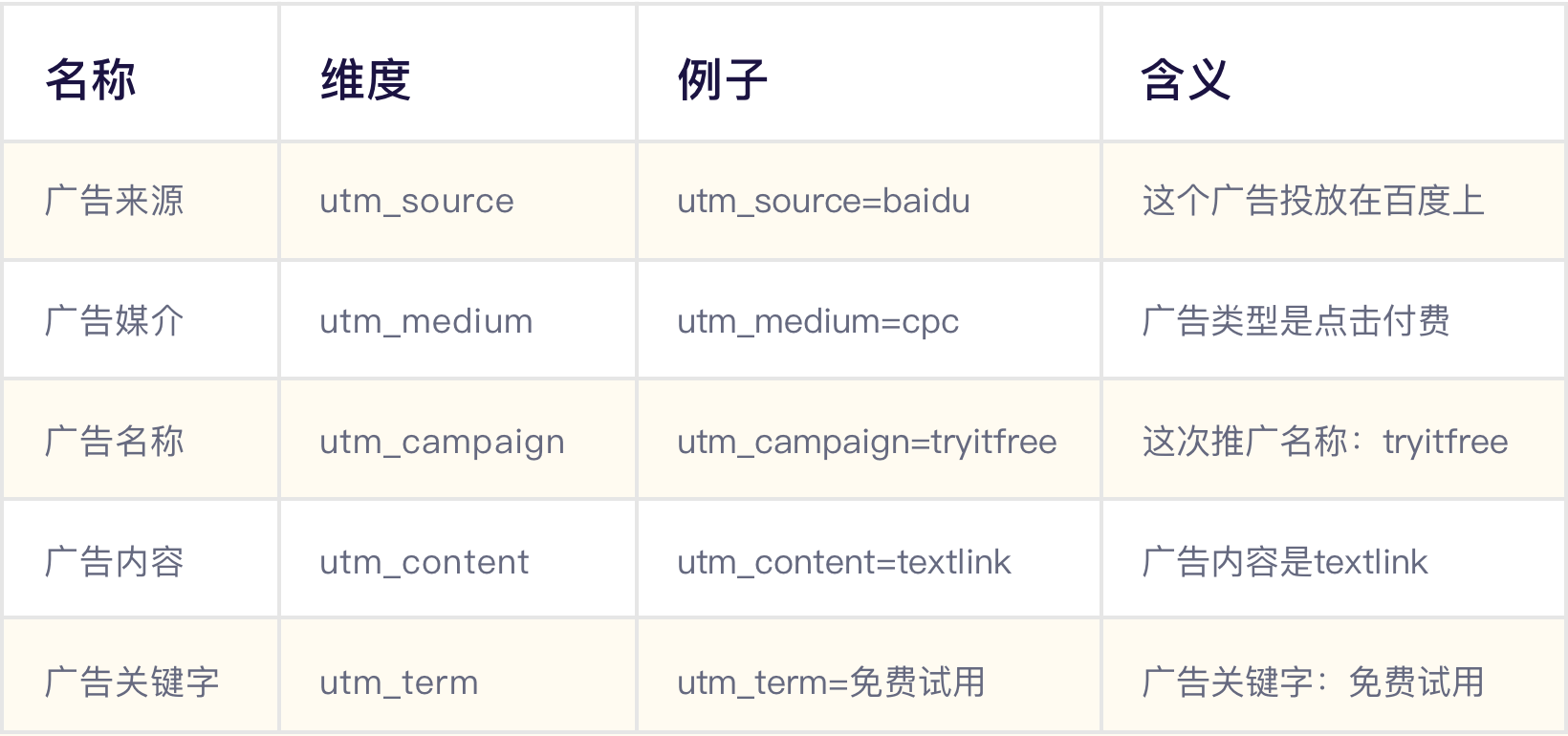 通过对投放链接 URL 添加参数,渠道投放方可以对投放或者推广的效果进行监测。目前常见的渠道监测机制是 UTM ,通过在URL 链接后面添加广告来源(utm_source)、广告媒介 (utm_medium)、广告名称(utm_campaign)、广告内容(utm_content)和广告关键字(utm_term)等5个维度参数,实现对站外流量的监测和分析。流量分析工具 Google Analytics 和用户行为数据分析产品 GrowingIO 都采用了 UTM 解决方案。