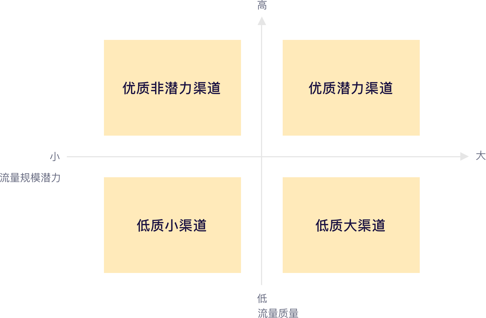 没有最好的渠道,只有最合适的渠道。因为大家的产品属性、用户群体等各不相同,对别人有用的好渠道,不一定适用于自己的产品。因此我们需要客观的通过分析渠道数据来判断哪些渠道是适合我们自己的。一般情况下,我们判断渠道的质量,会通过流量规模潜力和质量两个方面来评估。