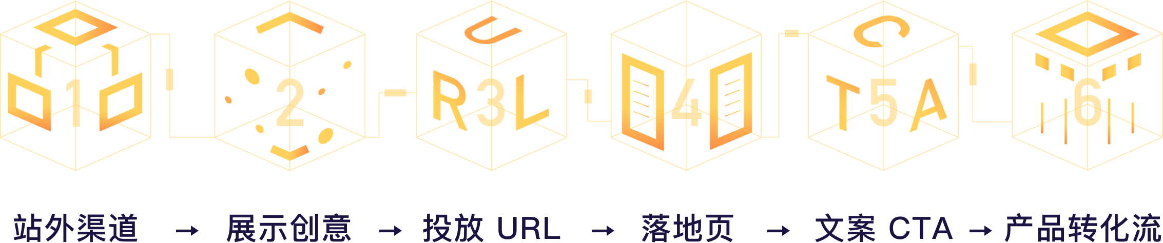 从最初的市场渠道、文案创意到用户在你内产品内完成转化(注册、下载、购买等),这是一个完整的用户旅程。这个用户旅程包活6个核心关键点,依次是:站外渠道、展示创意、投放 URL、辅助转化文案及 CTA、产品转化流。