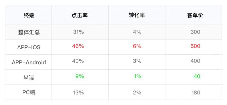 常见终端拆分如IOS/Android、APP/M/PC/小程序、使用设备机型等,通过对比不同端对整体大盘的贡献及不同端各数据指标的横向对比,可找出影响某一指标的关键端。下图案例中,APP端-IOS提升了关键指标,M端则拉低了关键指标。