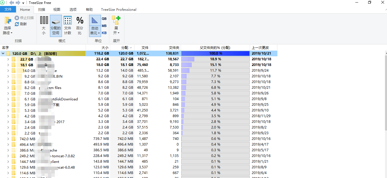 2、下载treesize free工具https://treesize.en.softonic.com/,免费安装的,安装后用管理员身份运行,即可随便查看任意目录的所有子目录大小,非常方便好用!