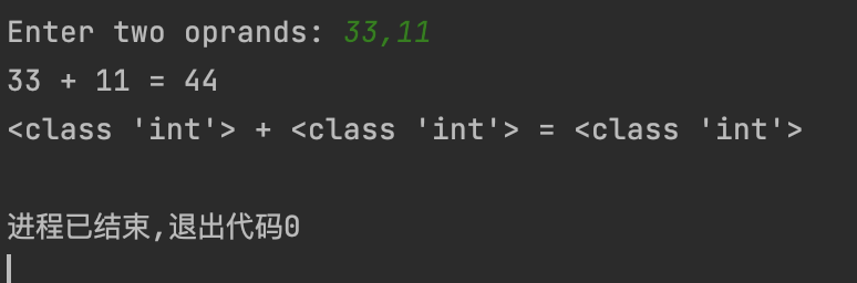 # 组合使用内置函数eval()和input() x, y = eval(input('Enter two oprands: ')) # 输入的两个操作数之间用逗号分隔(英文半角输入法下的逗号) ans = x + y print(f'{x} + {y} = {ans}') print(f'{type(x)} + {type(y)} = {type(ans)}')