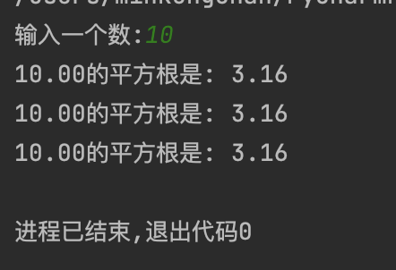 # 简单的数学计算 import math n = float(input('输入一个数:')) # python中计算开平方的三种方式 ans1 = n**0.5 ans2 = pow(n, 0.5) ans3 = math.sqrt(n) print('%.2f的平方根是: %.2f' %(n, ans1)) # 以传统风方式(%)输出 print('{:.2f}的平方根是: {:.2f}'.format(n, ans2)) # 使用str.format()方式输出 print(f'{n:.2f}的平方根是: {ans3:.2f}') # 使用f-string方式输出