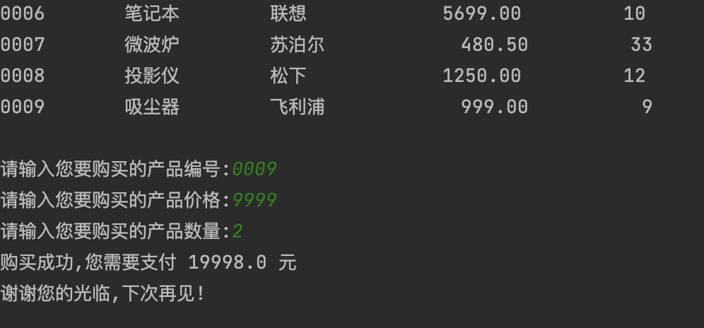 """ 家用电器销售系统 v1.0 """ #欢迎信息 print('欢迎使用家用电器销售系统!') #产品信息列表 print('产品和价格信息如下:') print ( '************************************') print('%-10s'%'编号','%-10s'%'名称','%-10s'%'品牌','%-10s'%'价格','%-10s'%'库存数量') print(' - - ' ) print('%-10s'%'0001','%-10s'%'电视机','%-10s'%'海尔','%10.2f'%5999.00, '%10d ' %20) print('%-10s'%'0002','%-10s'%'冰箱','%-10s'%'西门子','%10.2f'%6998.00, '%10d ' %15) print('%-10s'%'0003','%-10s'%'洗衣机','%-10s'%'小天鹅','%10.2f'%1999.00, '%10d ' %10) print('%-10s'%'0004','%-10s'%'空调','%-10s'%'格力','%10.2f'%3900.00, '%10d ' %0) print('%-10s'%'0005','%-10s'%'热水器','%-10s'%'美的','%10.2f'%688.00, '%10d ' %30) print('%-10s'%'0006','%-10s'%'笔记本','%-10s'%'联想','%10.2f'%5699.00, '%10d ' %10) print('%-10s'%'0007','%-10s'%'微波炉','%-10s'%'苏泊尔','%10.2f'%480.50, '%10d' %33) print('%-10s'%'0008','%-10s'%'投影仪','%-10s'%'松下','%10.2f'%1250.00, '%10d ' %12) print('%-10s'%'0009','%-10s'%'吸尘器','%-10s'%'飞利浦','%10.2f'%999.00,'%10d ' %9) print(' ' ) #用户输入信息 product_id= input('请输入您要购买的产品编号:') price=float(input('请输入您要购买的产品价格:')) count=int(input('请输入您要购买的产品数量:')) #计算金额 print('购买成功,您需要支付',price*count,'元') #退出系统 print('谢谢您的光临,下次再见!')