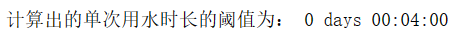 sj_bool = (sj['用水时长'] >100) & (sj['总用水时长'] > 120) & (sj['总用水量'] > 5) sj_final = sj.loc[sj_bool,:] sj_final.to_excel('D:\PhotoWork\大数据\数据\第七次\sj_final.xlsx',index=False) print('筛选出候选洗浴事件前的数据形状为:',sj.shape) print('筛选出候选洗浴事件后的数据形状为:',sj_final.shape)