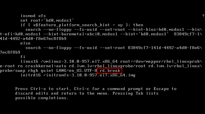 2、在linux16的行尾添加" rd.break",rd.break前有空格,按Ctrl+x引导系统