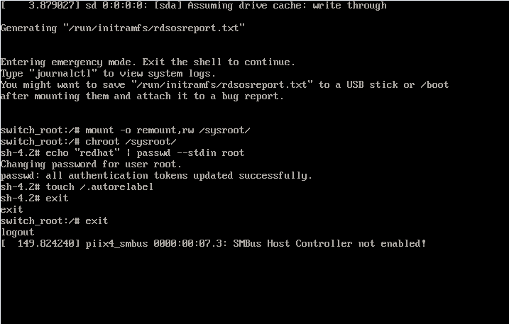 3、在swithch_root:/#命令提示符后依次输入以下命令,重置root密码为"redhat"