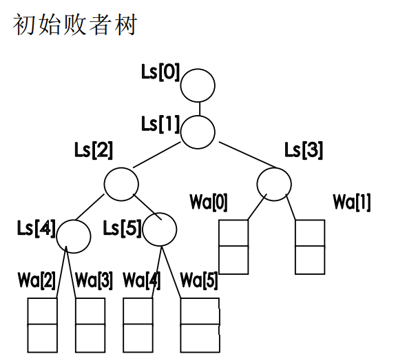 出建立的初始败者树及生成的初始归并段