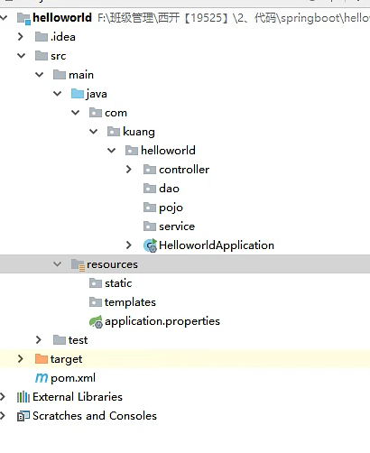 helloworldApplication是自动生成的类,controller,dao,pojo,service是自己建的包。
