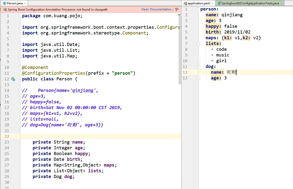 写上ConfigurationProperties(prefix="person")就代表与右边的yaml配置联系到了一起